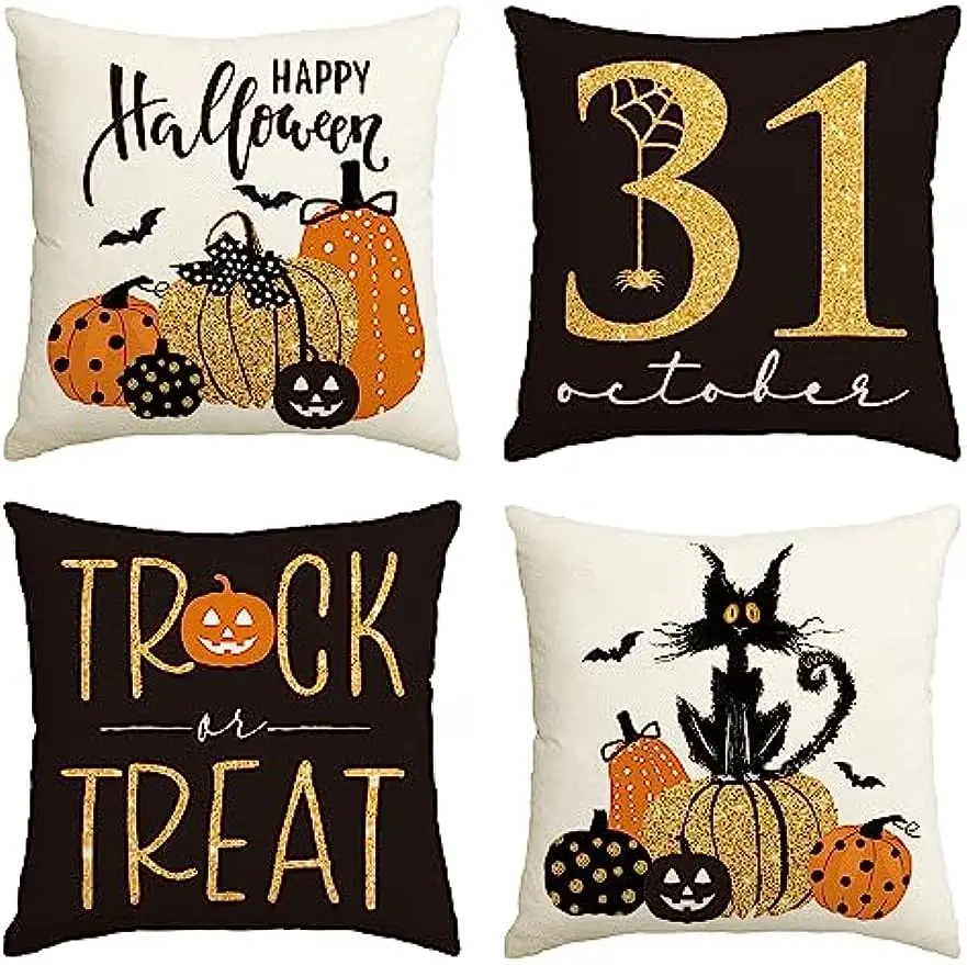 Produit | Housse de coussin halloween citrouille dorée et chat noir |